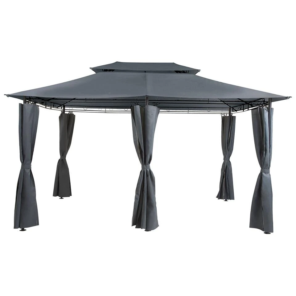 Modern tuinpaviljoen met donkergrijze gordijnen. Dit fantasierijke tuinpaviljoen creëert een schilderachtige sfeer in jouw tuin! Het paviljoen staat extreem stevig door zijn kwalitatieve haringen en hoogwaardige stalen constructie. Het praktische winddak en zijdelen van Uv-bestendig materiaal zorgen voor optimale zon en wind bescherming. De gordijnen zijn voorzien van praktische ritsen zodat je aan beide kanten uit de tent kunt stappen. Daarnaast kan je de gordijnen om de palen wikkelen, zodat jij en je gasten een mooi zicht op de tuin krijgen.