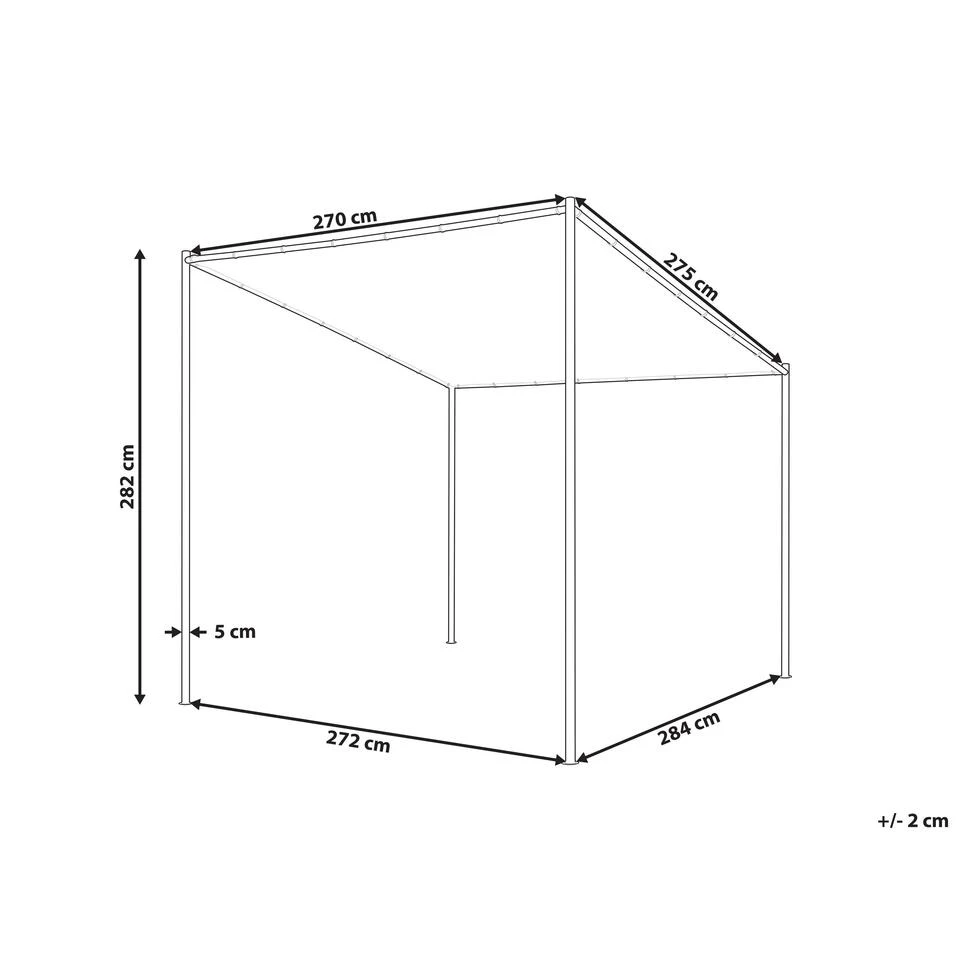 Extra informatie: Om veiligheidsredenen moet het paviljoen aan de grond worden vastgezet. De set bevat metalen haringen om het stuk op het gazon te bevestigen, maar het bevestigingsmateriaal voor andere oppervlakken is niet inbegrepen.