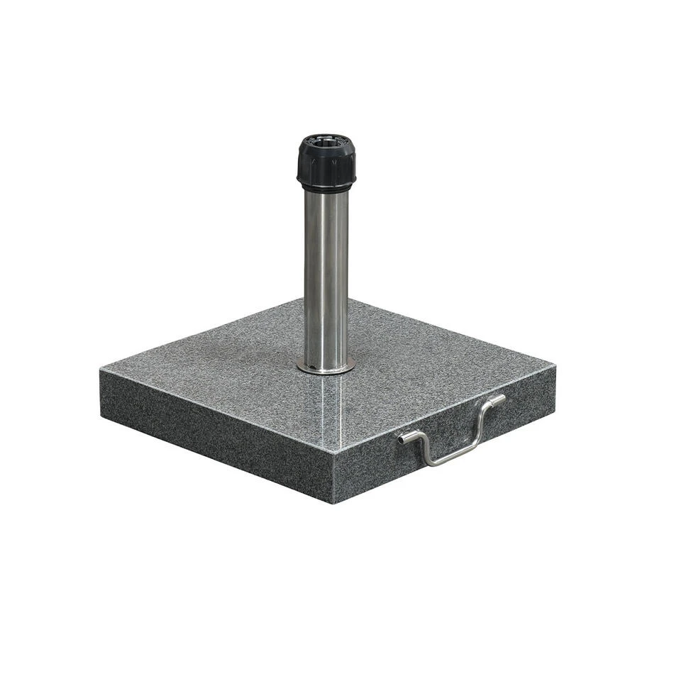 De Cosmo granieten parasolvoet is gemaakt van space grey kleurig graniet waarvan de bovenzijde is gepolijst, dit geeft de voet een strakke en luxe uitstraling. De parasolvoet is voorzien van twee nylon wielen met aan de tegenovergestelde zijde een mooi RVS handvat. Hierdoor is de voet gemakkelijk te verplaatsen naar elke plek in de tuin. De parasolbuis is gemaakt van RVS en is geschikt voor stokparasols met een maximale buisdikte van 55 millimeter.