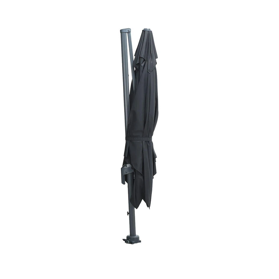 De zweefparasol is verticaal te kantelen en 360 graden rond te draaien. Ideaal om met de zon mee te bewegen zonder de hele parasol te moeten verplaatsen. Bij deze zweefparasol moet minimaal een 80 kg hawaii parasolvoet. De zweefparasol is licht van gewicht en kan makkelijk opgeborgen worden in de schuur wanneer er slecht weer aan komt. Doe je de parasol ’s avonds dicht dan kun je er een hoes over heen doen, die los aangeschaft kan worden. Het parasoldoek heeft een zwarte kleur.