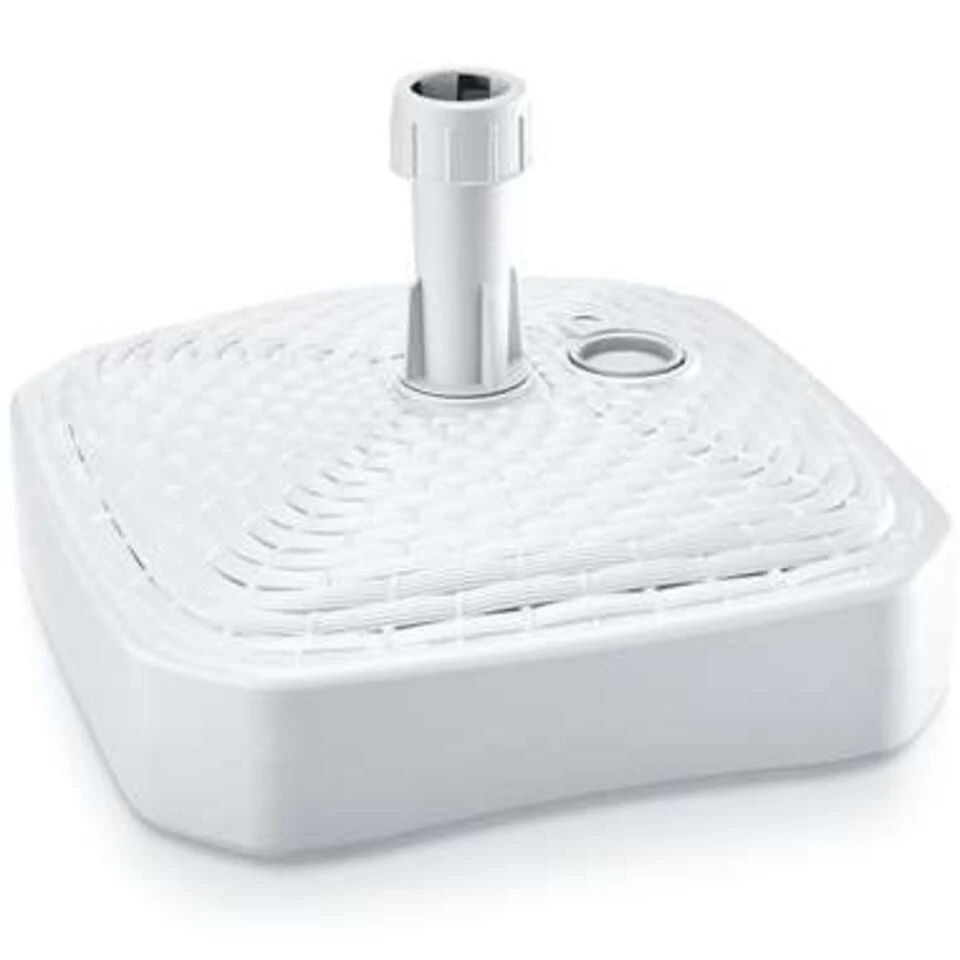 1x Stuks vierkante rotan kunststof parasolvoeten wit 12 liter. Formaat: lengte: ca 39 cm. Breedte: ca 39 cm. Hoogte: ca 13 cm. Aantal liters: 12. Materiaal: kunststof.